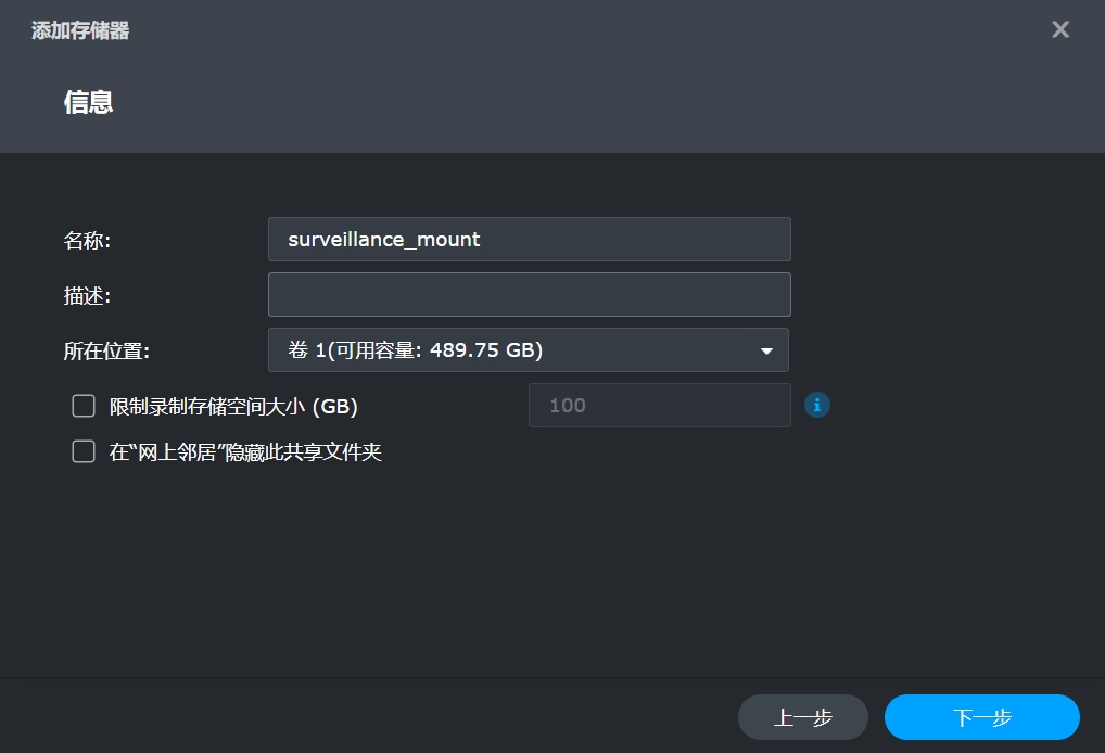 打开Surveillance-录制-归档设置-新增-添加存储器-添加共享文件夹-名称我这里填写surveillance_mount